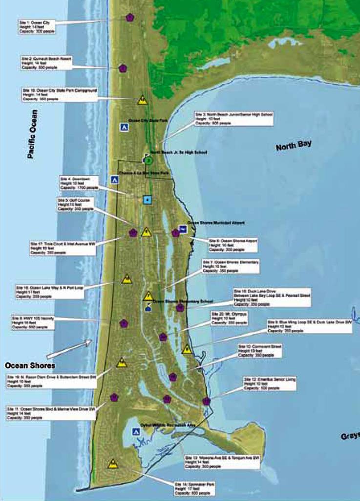 Ocean Shores would be the third community on the coast to build a tsunami-safe structure if the proposed project receives funding. The first was atop the Ocosta Elementary School gymnasium in Westport, designed to provide safety for 1,000 people in the event of an earthquake or tsunami, making it the first vertical-evacuation shelter in North America. The Ocosta project was paid for by the community itself though a school bond, Dixon noted, but its completion also opened the door for FEMA approval of similar projects in the future to mitigate the potential disaster from such a major geologic catastrophe.