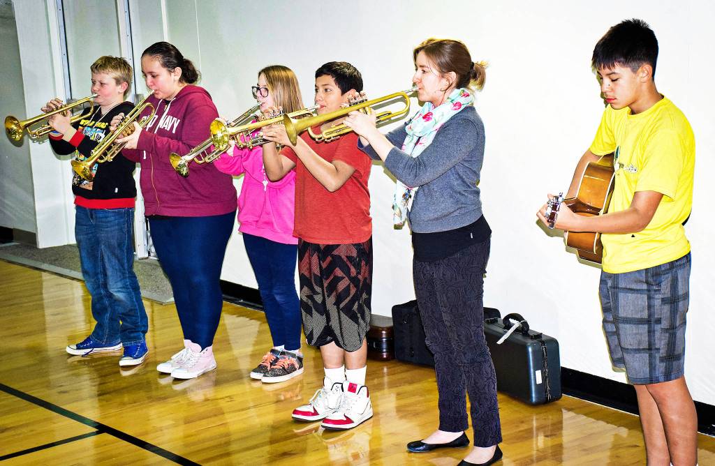 VFW members then recognized all of the OSE students who participated in two patriotic essay contests. Winners of “How the American Flag Makes Me Feel” were Jett York, 1st; Arabella Ramirez, 2nd; Kaylynn Harig, 3rd; and Damian Gallegos, 4th. “Why I Honor the Flag” winners were Elton Rockey, 1st; Keylah Dawson, 2nd; and Katarina Butler, 3rd. The assembly ended with “Taps,” by trumpeters Ben Meyers, Lilia Roldan, Cecilia Trudeau, Dameon Morales, Ms. Emma Eliason, and guitarist Isaac Bighead.