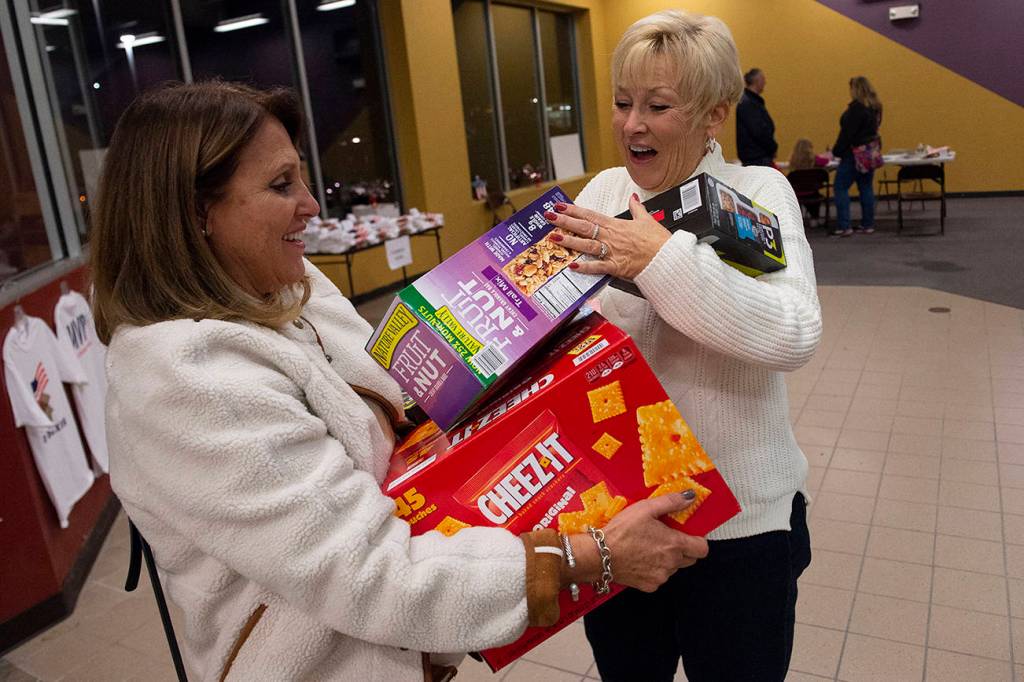 Patrick Raycraft | Hartford Courant                                 Karen Cote, right, welcomes Donna Bordonaro’s donation of food items to Hero Boxes.