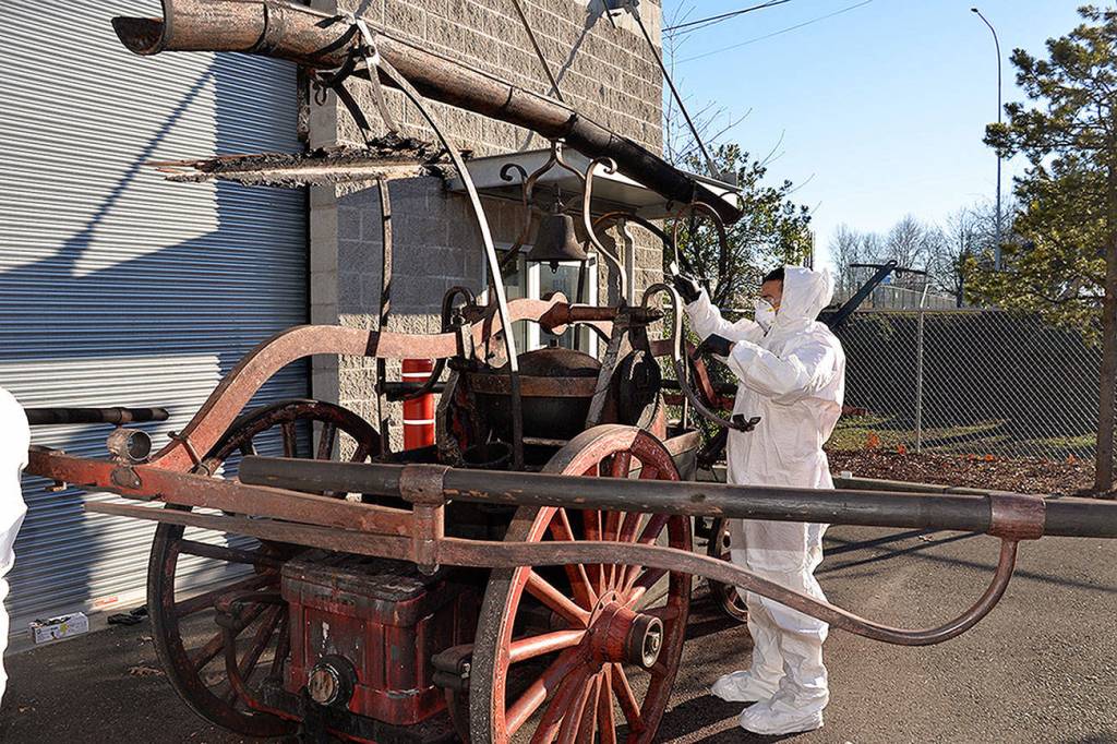 It’s a sunny day at the Restoration Management Company in Kent and in a parking lot next to a busy street several workers clad in white hazmat suits are cleaning a layer of soot off the Old Tiger fire cart — one of the older vehicles recovered from the Aberdeen Museum of History fire.