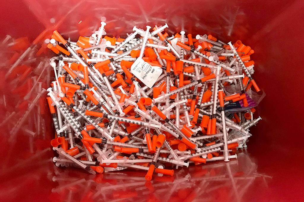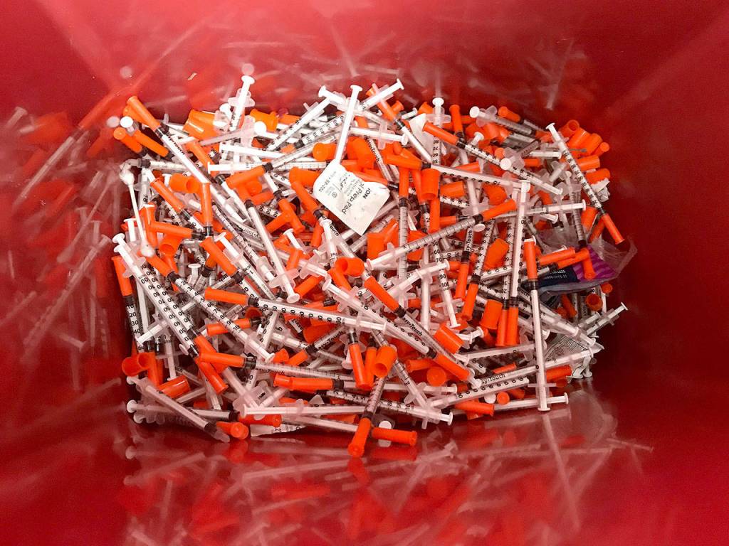 A bucket of used syringes disposed at Aberdeen’s needle exchange recently.