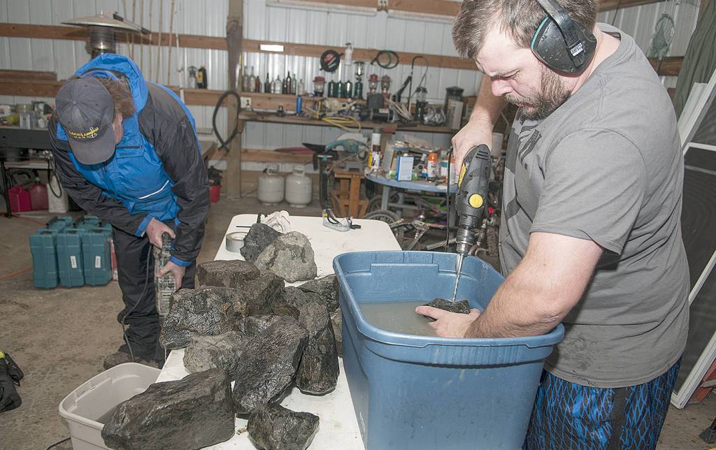 “Richard Harris, who hosted the rock-drilling event, gathered and washed local basalt weighing 3 to 40 pounds. We sorted the stock into three sizes and drilled the appropriate size hole. After cleaning and drying the hole, Diana McCandless secured the tracking device with silicone.”