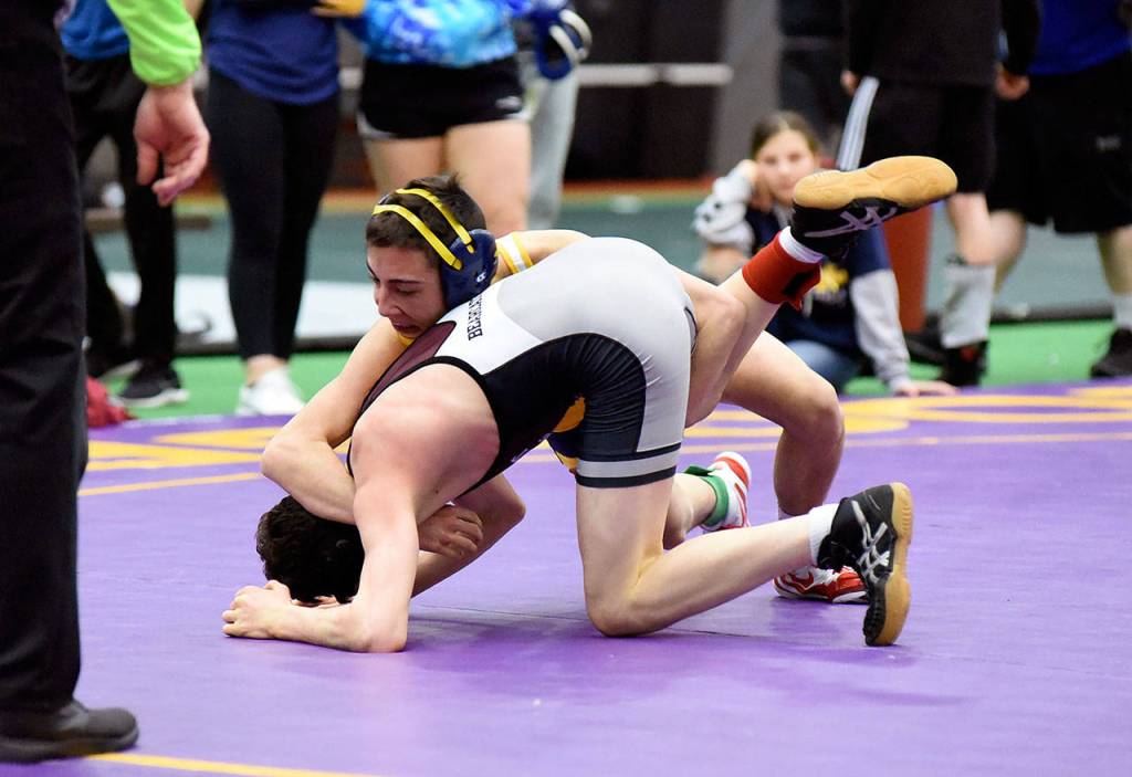 Kai Olson earned a spot in the regionals and a 190-pound district title with a pinfall win over Elma’s Taitum Brumfield at the 5:29 mark of their title match.