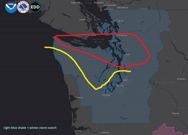 The second storm is expected to produce 5 to 8 inches of snow in the lowlands. There’s a winter storm watch for Monday through Tuesday in all areas of western Washington except the central coast. Areas east of Aberdeen are not included in the winter storm watch, according to a National Weather Service graphic.