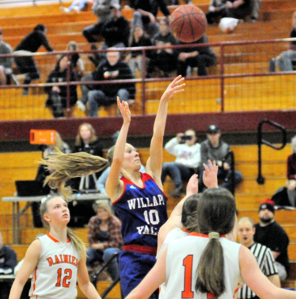 Top Players: Willapa Valley – Patrick (14 pts., 3 ast., 6 reb.), Cook (13 pts., 5 reb.) Adkins (12 pts.), Cami Swartz ( 8 reb. 2 blk.); Rainier – Schultz (27 pts.)