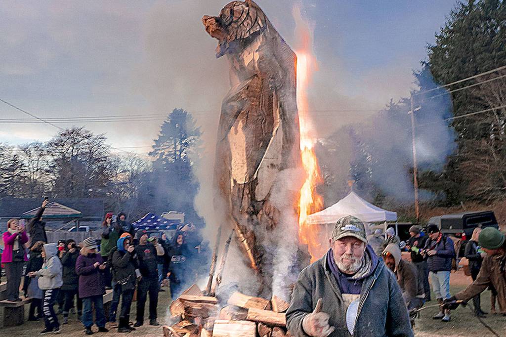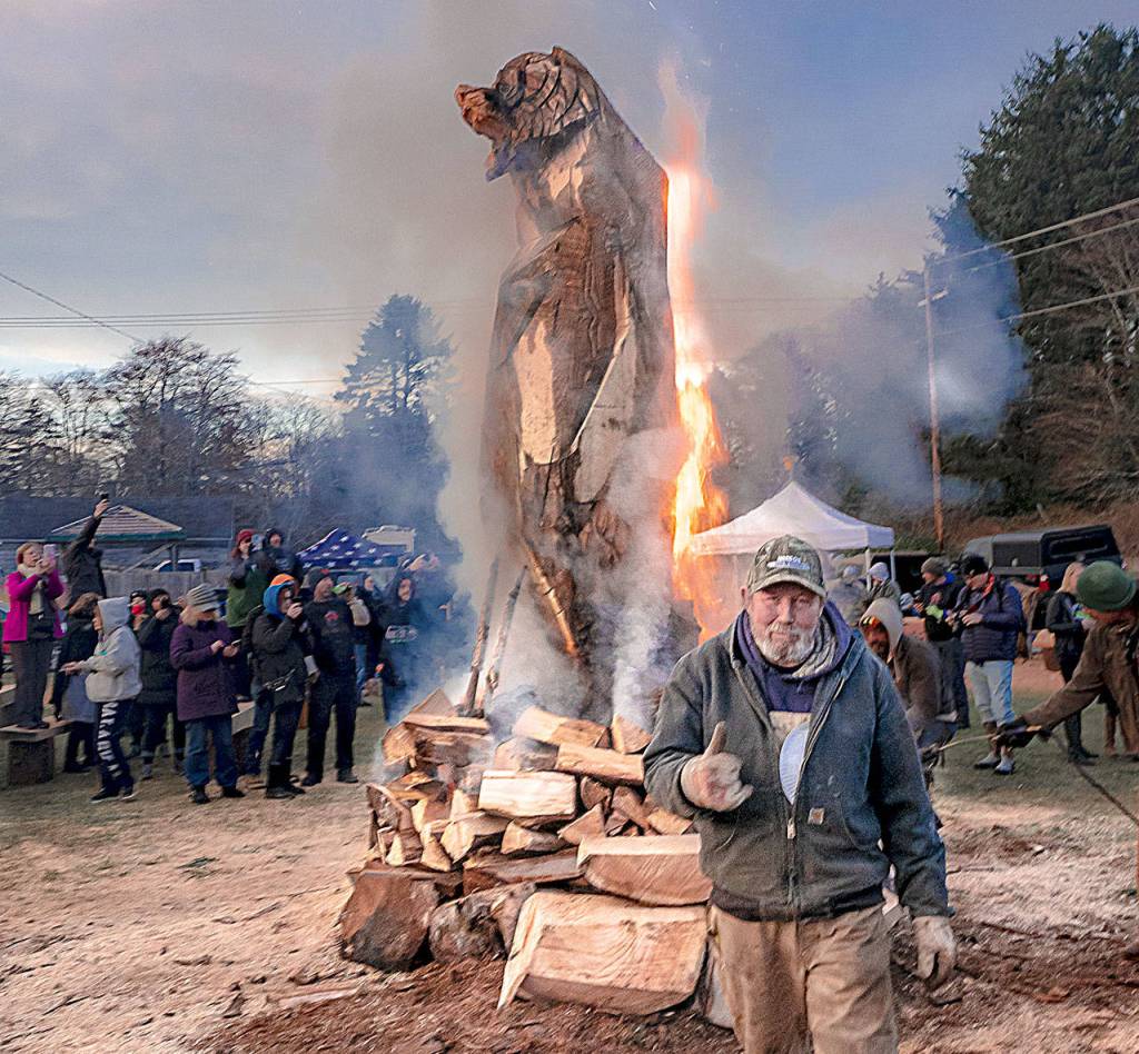 The 11th annual Burning Bears celebration lit up the sub-freezing night at the Ocean City Market Place last Saturday, with one of the founders of the event, Ivan Hass, foreground, presiding over the festive burning of the 12-foot carved bear. Along with the community bonfire, dozens of chainsaw artists from around the area hold an auction at the Market Place, which has become a fixture for wood arts and crafts in the bend on State Route 109. (Photo by Chris Brunstad)