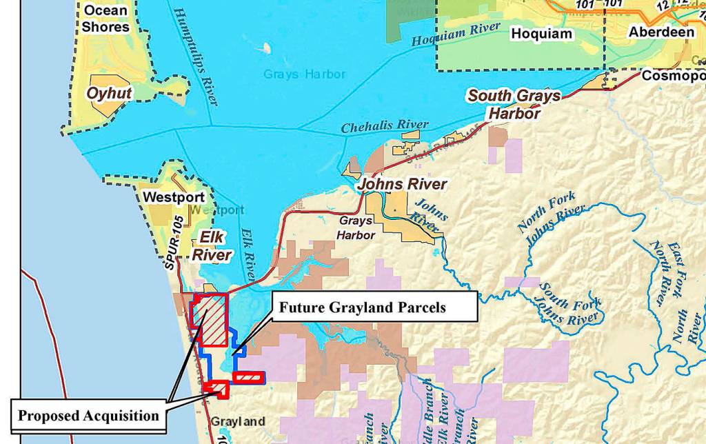 There are three different parcels shown on the purchase proposal map supplied by Fish and Wildlife; the largest is bordered on the north by State Route 105, and on the west by Twin Harbors State Park and State Route 105 south for about 2 miles. The north end of the purchase property is adjacent to the Elk River Unit of the Johns River Wildlife Area, a popular spot among birders and waterfowl hunters. The two smaller sections are located about two miles south of the larger parcel.