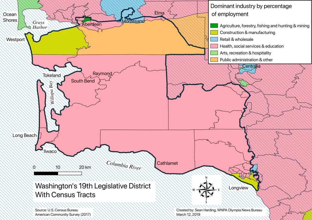 The 19th Legislative District reaches the western half of the Capitol State Forest and is bounded by U.S. Highway 12 in the north, covering Aberdeen and Montesano and extending to Washington’s Pacific Coast south to the Columbia River.