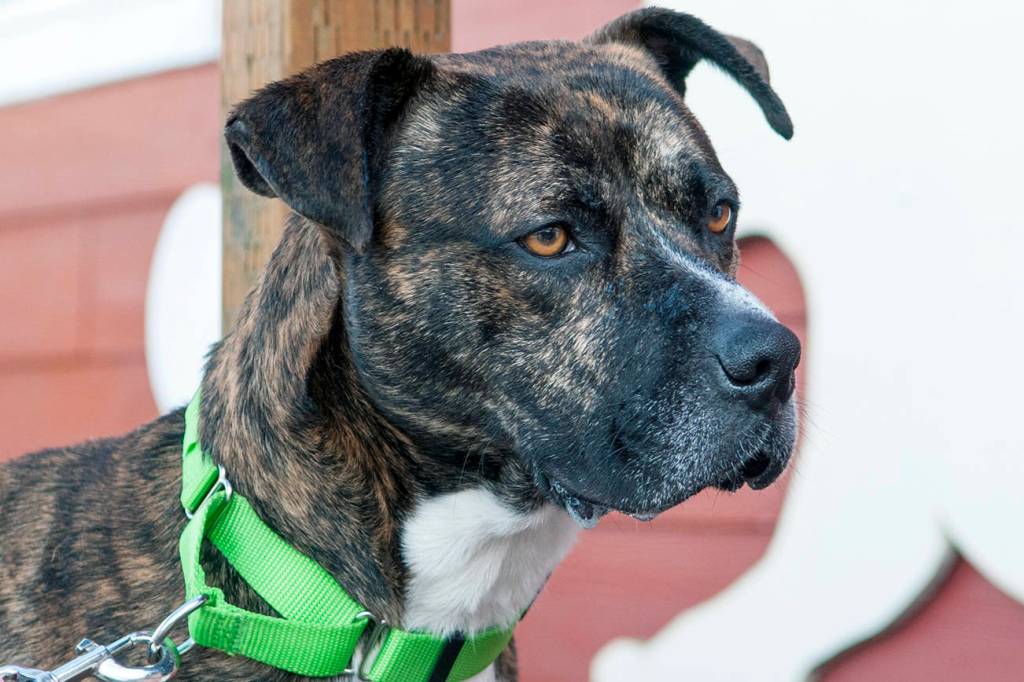 Buck, a boxer/pit mix, loves people and small dogs. He wants to cuddle all day long. Buck will turn 5 in May and has a healthy fear of cats.