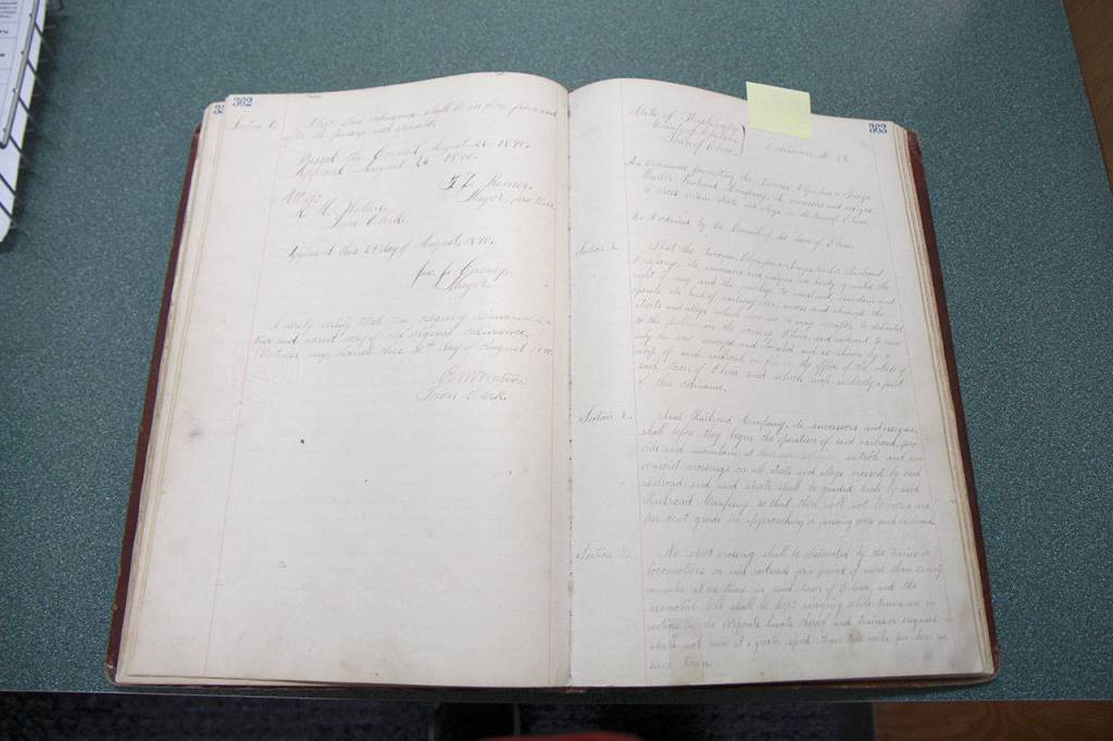 A.H. Kennedy, mayor pro tem in October 1890, signed the ordinance. At the time, the railroad referenced was “the Tacoma, Olympia & Grays Harbor Railroad Company, its successors and assigns,” according to the ordinance.