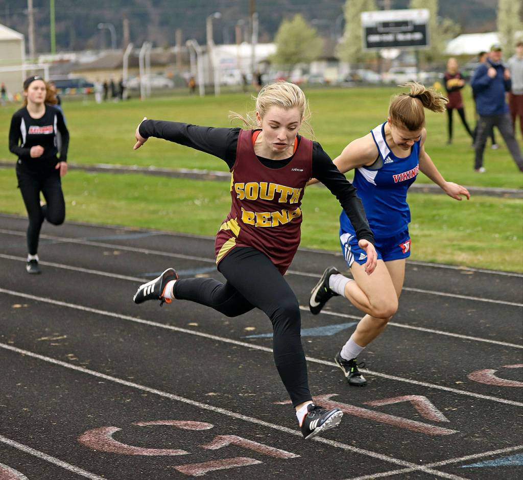 100 — 1, Hannah Byington, South Bend, 13.40. 2, Brooke Friese, Willapa Valley, 13.50. 3, Kendall Thompson, Raymond, 14.37.