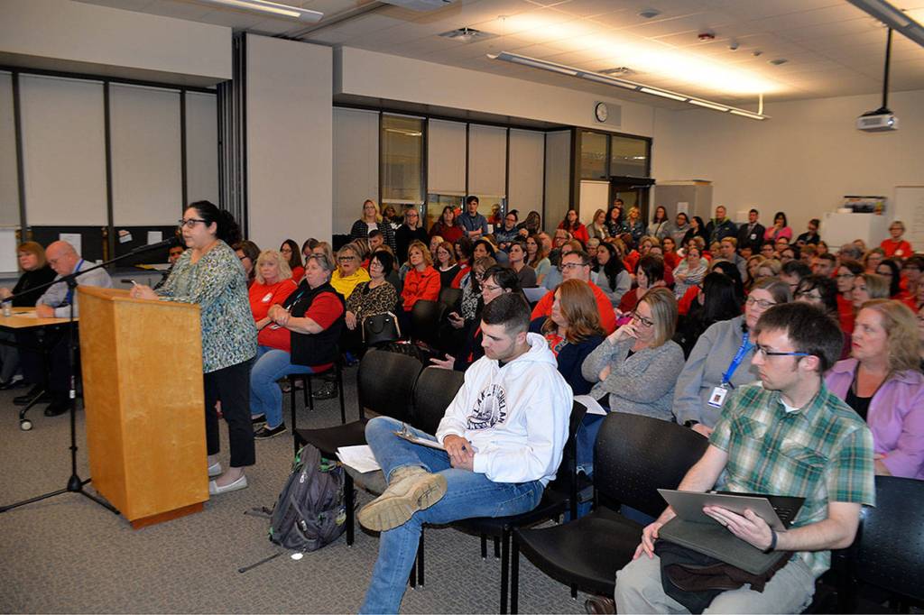 The school board meeting in the Community Room at Aberdeen High School Tuesday night was packed with teachers, parents and community members concerned about a plan to reduce staff — 23 through layoffs and 23 more through attrition — for next school year.