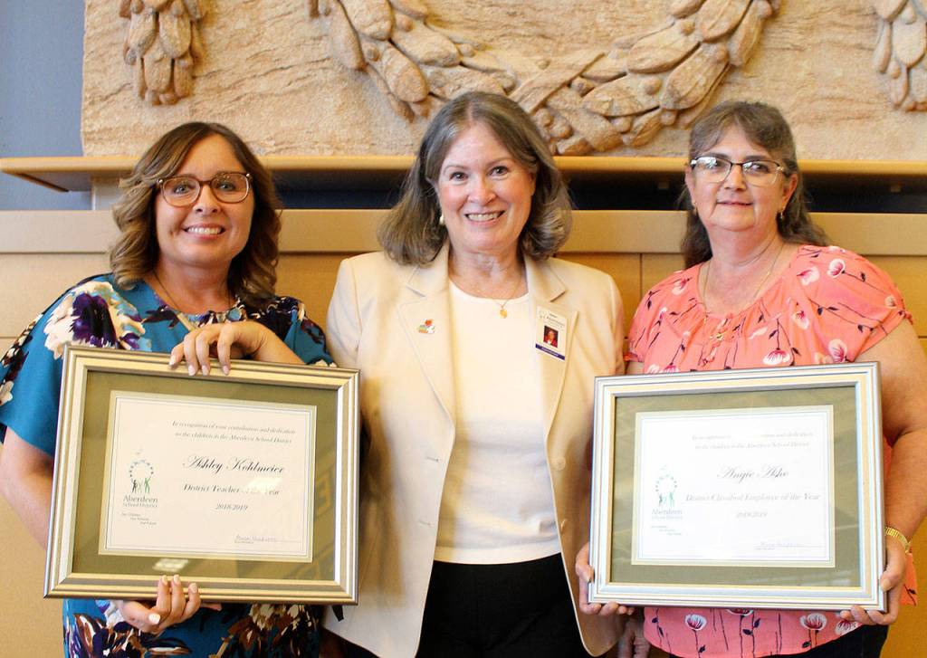 Ashley Kohlmeier, an English teacher and leadership adviser at Aberdeen High School, has been chosen as the Aberdeen School District’s Teacher of the Year, while Angie Ashe, a longtime bus driver, was selected as Classified Employee of the Year. The awards were announced at the annual employee recognition dinner Monday at Aberdeen High School.
