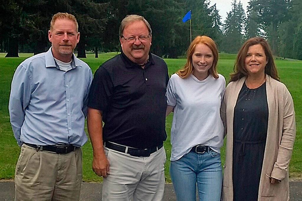Montesano High School golfer Glory Grubb, second from right, is flanked by, from left, Chris Grubb (father), Grays Harbor women’s golf coach Brian Davis, and Kim Gherna (mother) after Grubb signed a National Letter of Intent to compete for Grays Harbor next season.