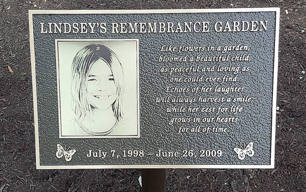A plaque was placed in the garden Wednesday. With a picture of Lindsey, it reads: “Like flowers in a garden, bloomed a beautiful child, as peaceful and loving as one could ever find. Echoes of her laughter will always harvest a smile, while her zest for life grows in our hearts for all of time.”