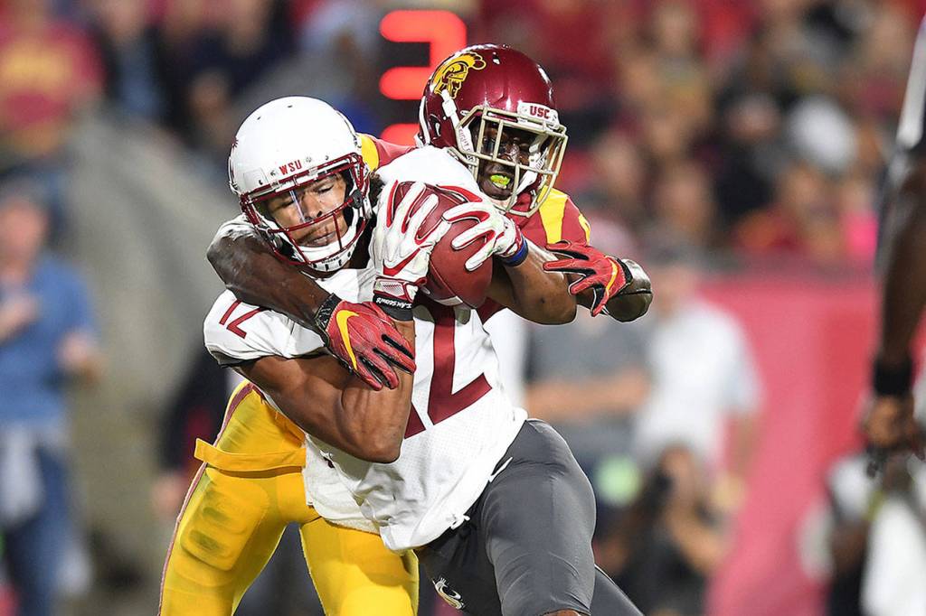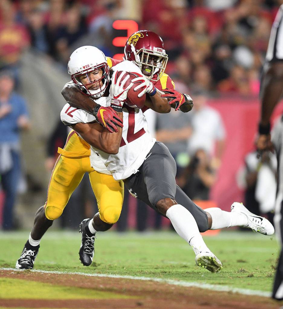 Washington State receiver Dezmon Patmon catches a 7-yard touchdown pass in front of USC cornerback Greg Johnson in the second quarter at the Los Angeles Memorial Coliseum on Friday, Sept. 21, 2018. (Wally Skalij/Los Angeles Times/TNS)
