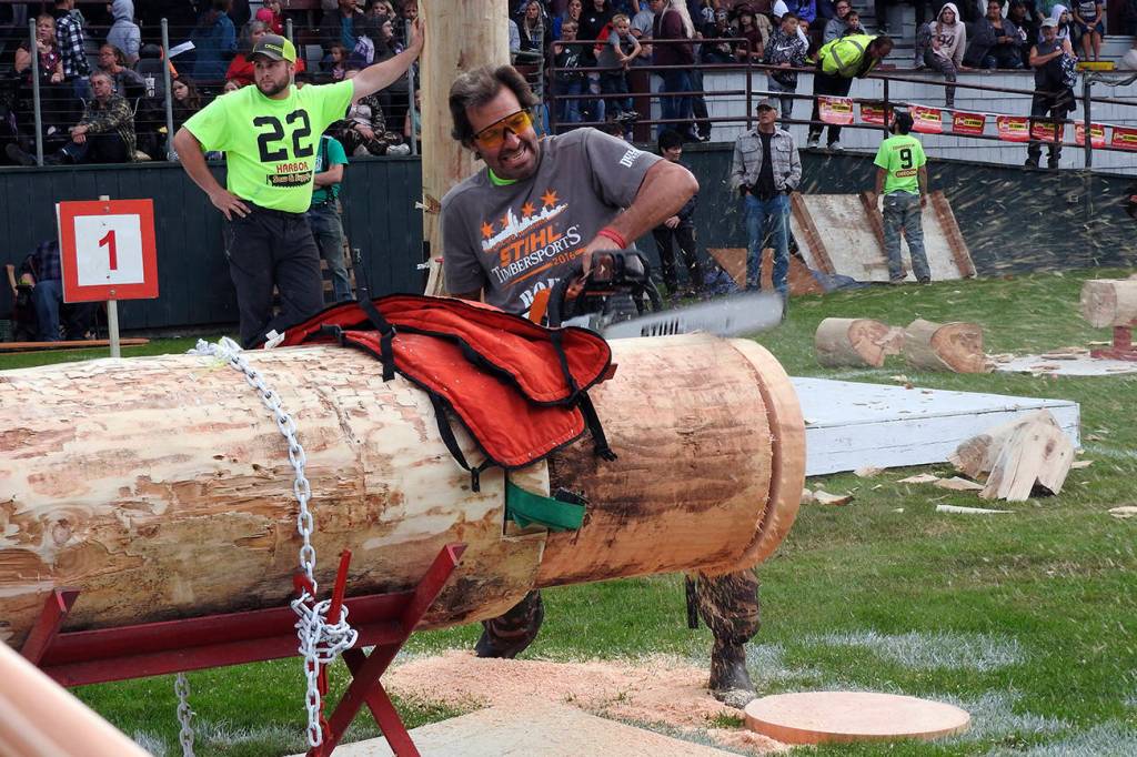 Competitor Chester Isaacson provided some unexpected entertainment, too. He showed up in loose gym shorts instead of jeans, and his chainsaw chewed up a piece of them as he prepared for his turn at the Obstacle Pole. He escaped with just a scrape.