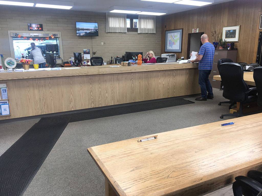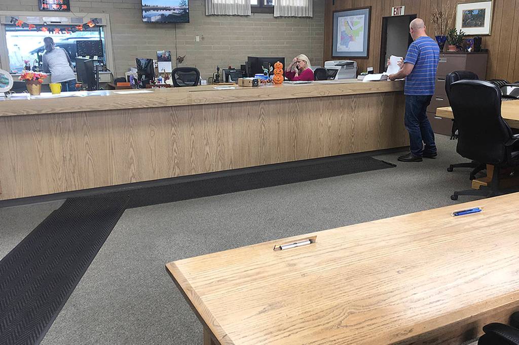 (Daily World Photo) Just about all the physical aspect of Cosmopolis’ city government will fit in this room, originally built as a bank. This fall voters in the city will decide whether to build a municipal building next door for City Hall, the court and the Police Department. Tuesday night at the fire hall is the first of three public meetings to discuss the issue. Working in the office Friday afternoon were, from left Kristina Eccles, Cheryl Chrt and Police Chief Casey Stratton. Behind him is Candice Makos.                                (Daily World Photo) Just about all the physical aspect of Cosmopolis’ city government will fit in this room, originally built as a bank. This fall voters in the city will decide whether to build a municipal building next door for City Hall, the court and the Police Department. Tuesday night at the fire hall is the first of three public meetings to discuss the issue. Working in the office Friday afternoon were, from left Kristina Eccles, Cheryl Chrt and Police Chief Casey Stratton. Behind him is Candice Makos.