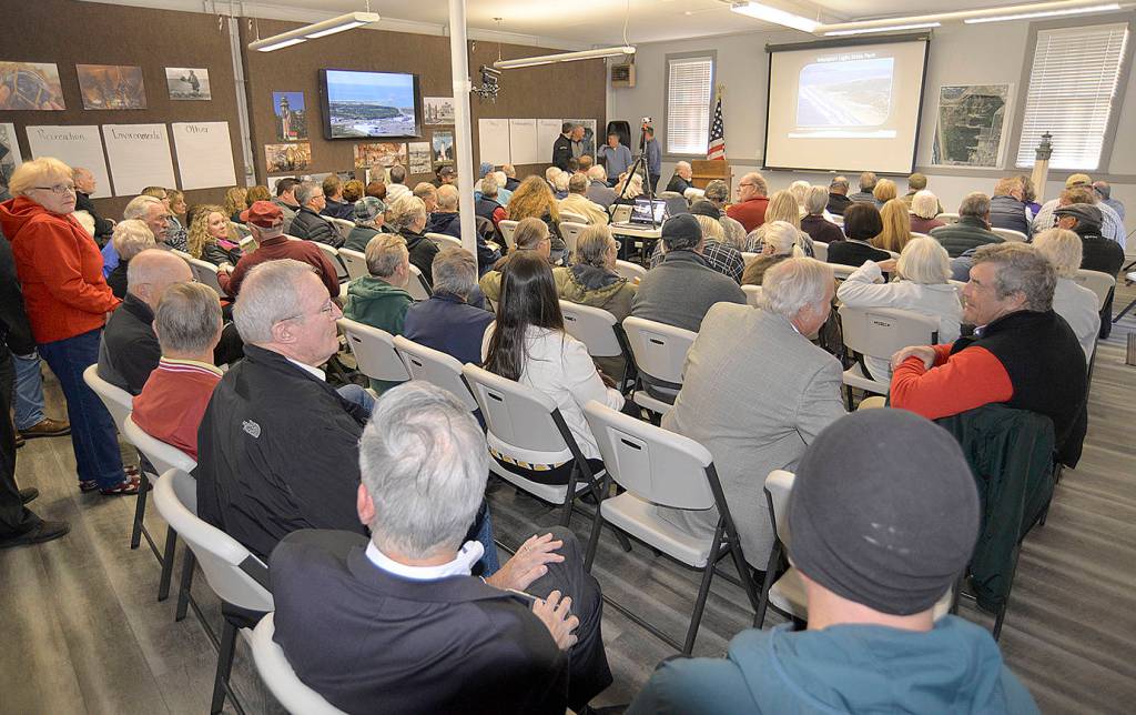 Photo by DAN HAMMOCK | GRAYS HARBOR NEWS GROUP                                It was standing room only at McCausland Hall by the time a State Parks open house to gauge public interest in a Scottish links-style golf course at Westport Light State Park began at 6 p.m. Tuesday.