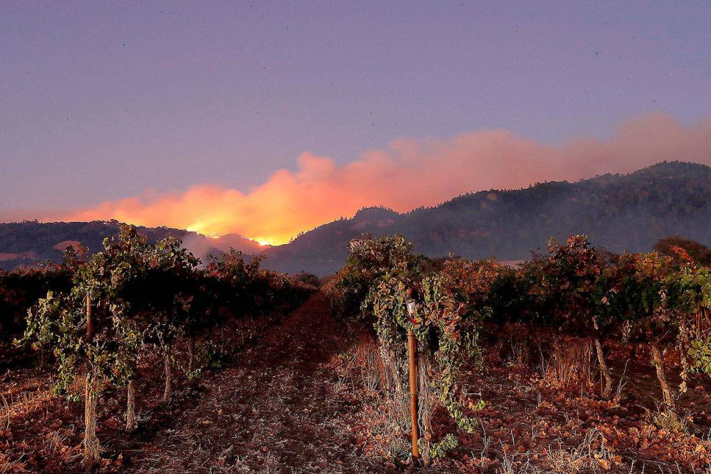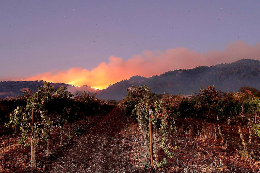 The Kincade fire burns in the hills above the vineyards of the Alexander Valley, near Geyserville, Calif. (Luis Sinco/Los Angeles Times)