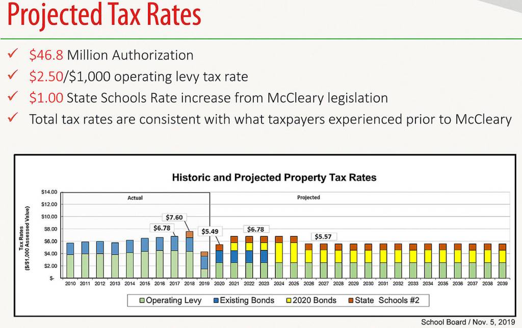 The bond sale will be scheduled so that payments are interest-only until the high school is paid off, according to the schedule presented to the board. The total combined tax rate – local bonds, local levy and the state schools tax – is projected to equal the 2017 rate of $6.78 per $1,000 of assessed value through 2025, after which it will decrease to $5.57 per $1,000 of assessed value.