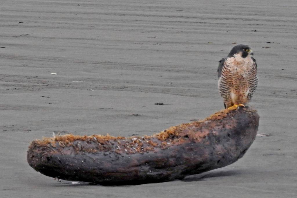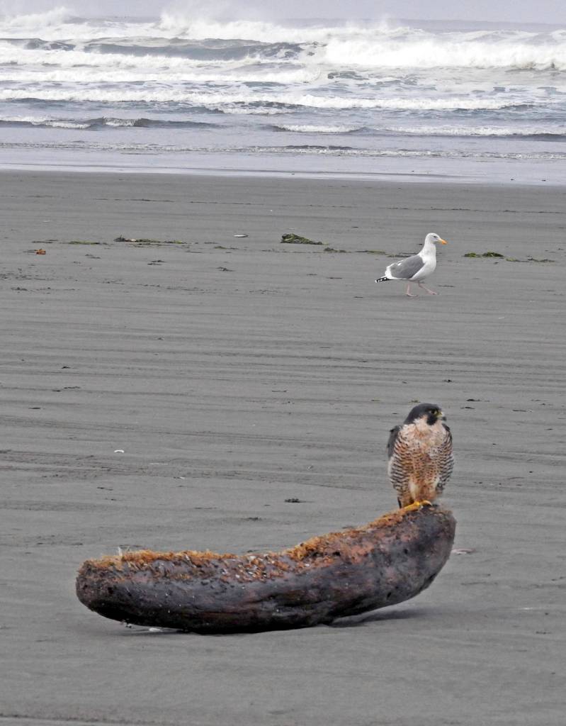 We drove onto the beach at dawn via the Damon Road access and went south to the jetty, then north all the way to the Copalis River. Along the way, we spotted eight bald eagles, two peregrine falcons and a northern harrier. (We also saw a wide assortment of other birds; two coyotes; some surf fishermen; and miscellaneous flotsam.)