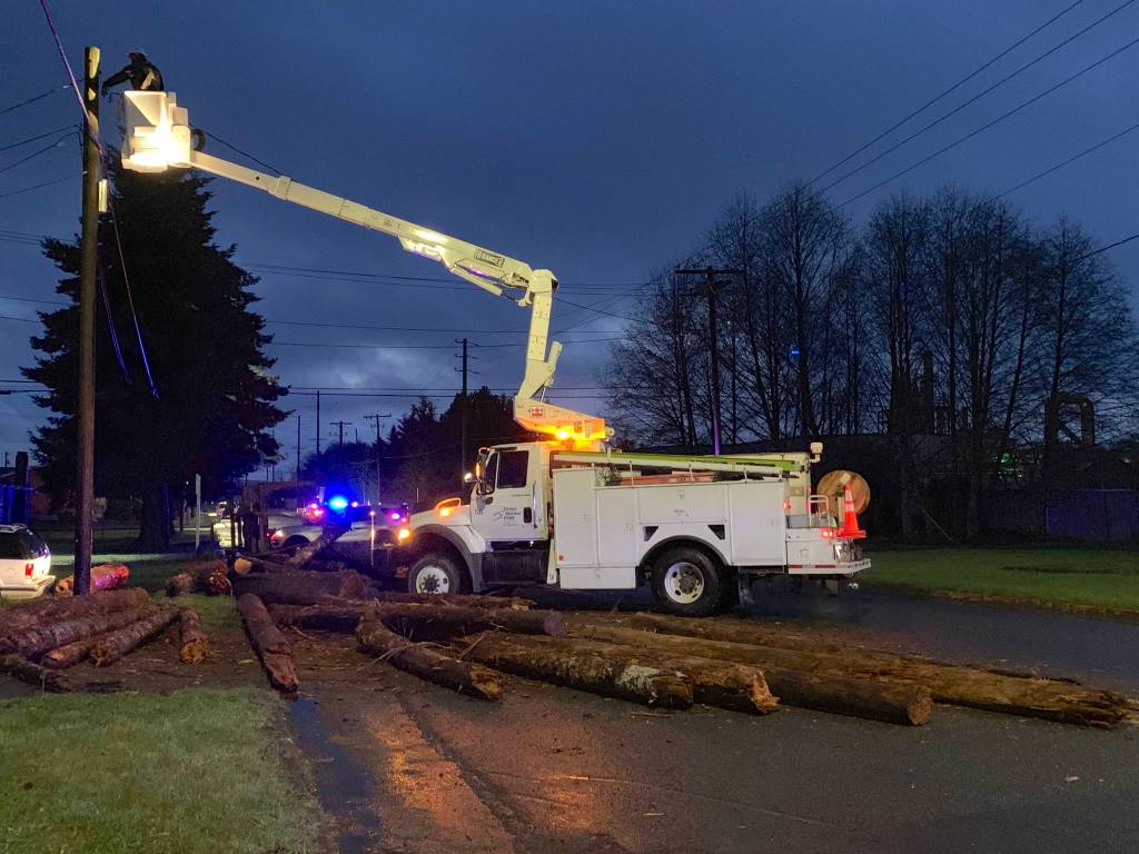 A PUD crew checks a power pole near the Simpson Avenue Bridge in Hoquiam Friday evening. A log truck lost its load going around a corner at 22nd Street and some of the logs rolled into the pole.