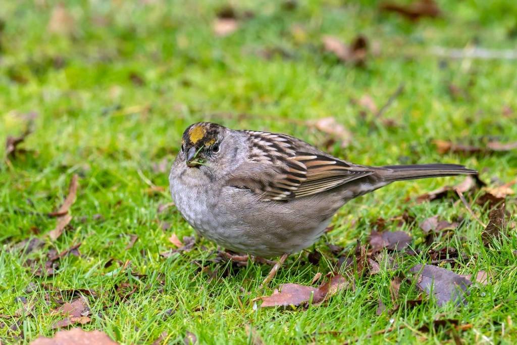 Behavior: Golden-crowned Sparrows feed on the ground or in low brush. In migration and winter they can be found feeding on the ground in the open in mixed flocks containing towhees, White-crowned Sparrows and finches and retreat to the bushes when disturbed. They often perch higher to deliver their mournful-sounding song.
