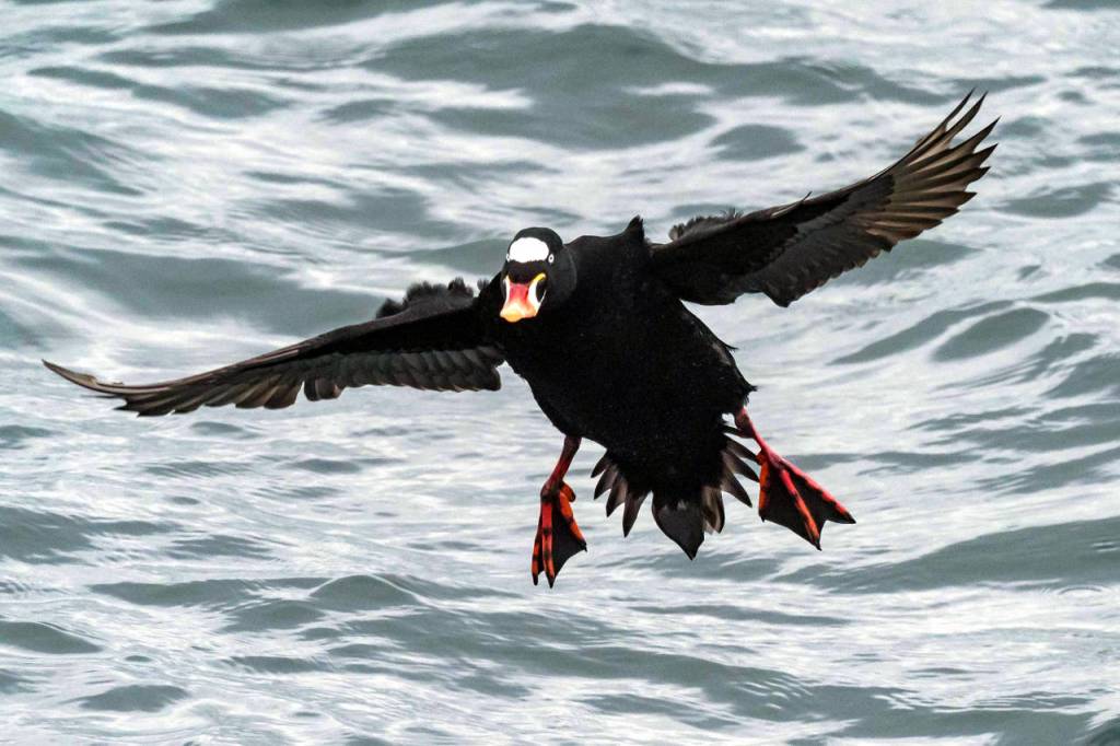 Behavior: Surf Scoters spend most of the year in large rafts on the surface of the ocean or open bays and inlets diving for food or taking it from man-made structures. They need a running start to get airborne from the water but are strong flyers. They begin courtship displays as soon as they arrive on their wintering grounds.