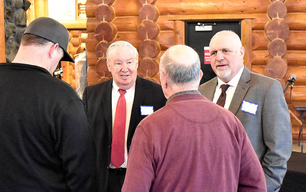 DAN HAMMOCK | GRAYS HARBOR NEWS GROUP                                 Port of Grays Harbor Commissioners Stan Pinnick, left, and Phil Papac chat with guests at the Port’s annual business report breakfast at the Rotary Log Pavilion in Aberdeen Wednesday.