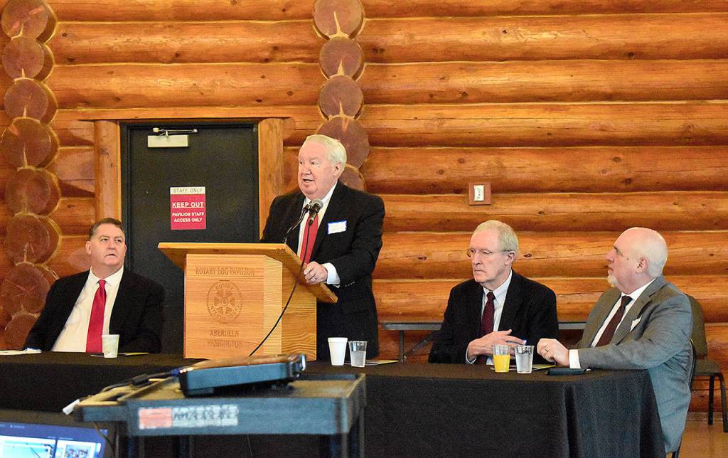 Port of Grays Harbor Commission President Stan Pinnick delivers his remarks at the Port’s annual business report breakfast Wednesday. From left are Port Executive Director Gary Nelson, Pinnick, and Port Commissioners Tom Quigg and Phil Papac.
