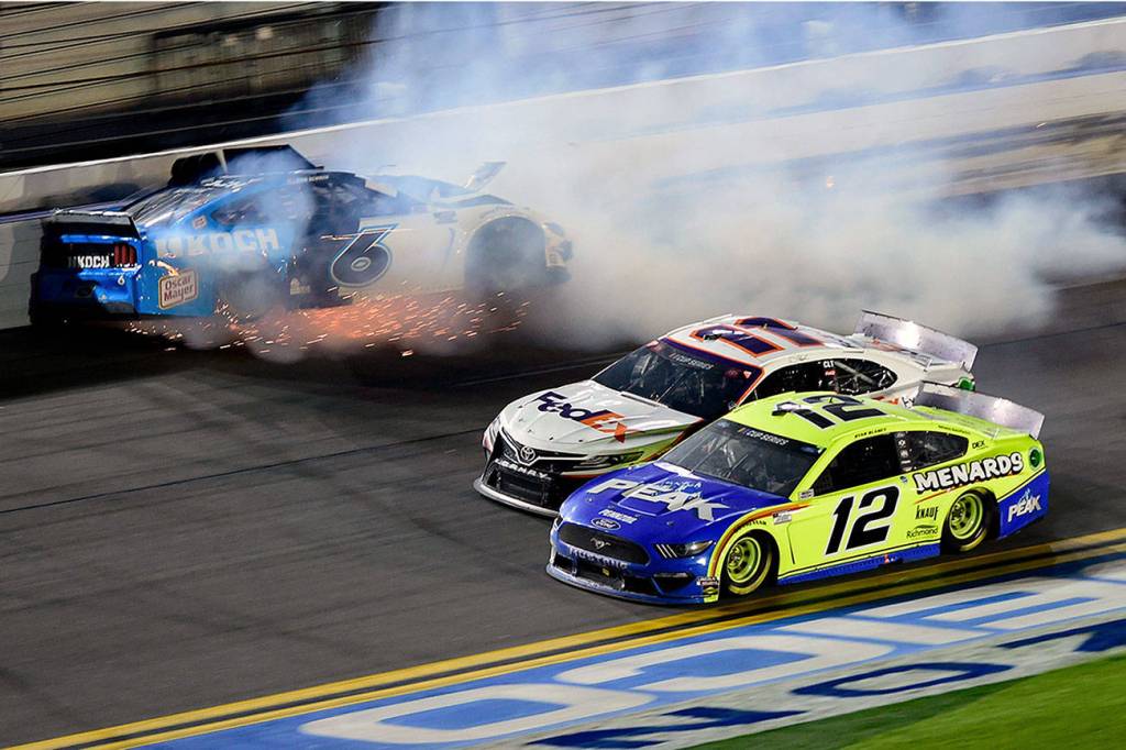 Denny Hamlin, driver of the No. 11 FedEx Express Toyota, and Ryan Blaney (12) race to the finish as Ryan Newman (6) wrecks on the last lap of the NASCAR Cup Series 62nd Annual Daytona 500 at Daytona International Speedway on Monday in Daytona Beach, Fla. (Jared C. Tilton/Getty Images/TNS)