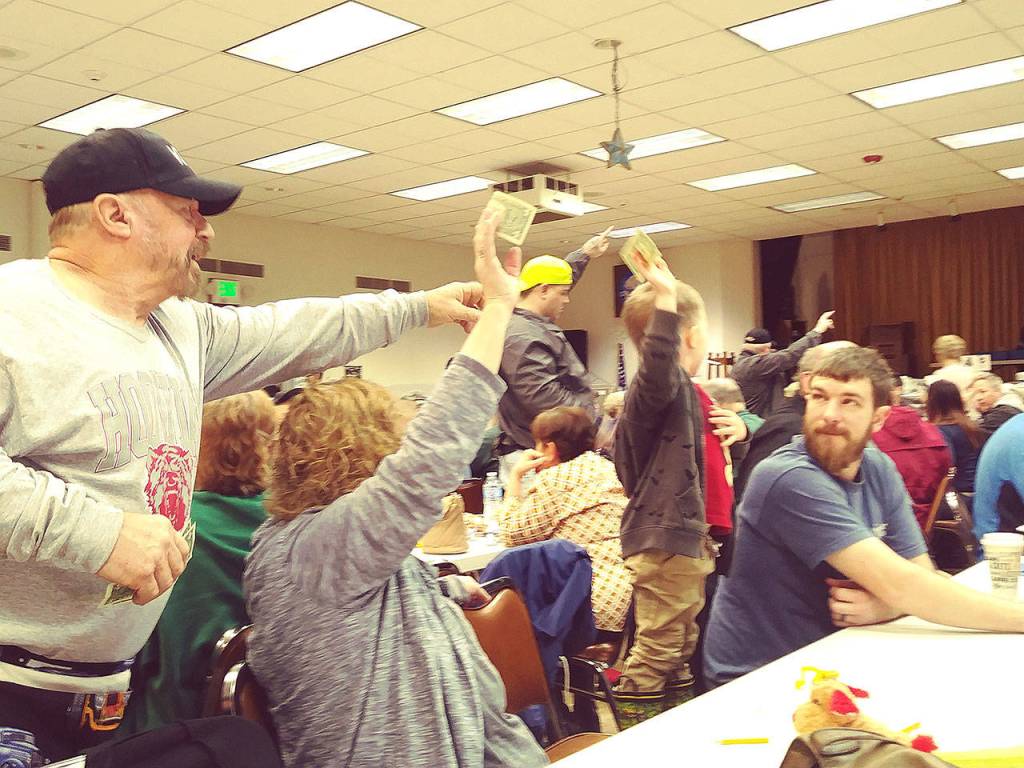 Cosmopolis Mayor Kyle Pauley is a regular attendee of the event and took home the second item out of the gate — a $50 bill and $50 worth of lottery scratch tickets. Pauley put a total of $3 into the bidding, which ended at $286. The lottery tickets ended up being worth $43 when scratched, so Pauley netted $90 on his $3 investment.