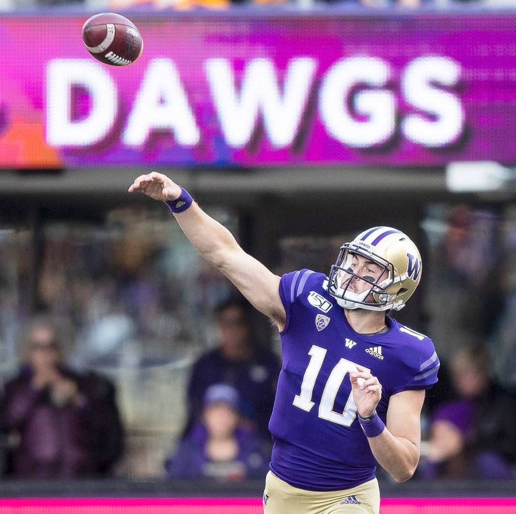 Andy Bao | Seattle Times/TNS Washington Huskies quarterback Jacob Eason (10) passes during the second half against USC on Saturday, Sept. 28, 2019 at Husky Stadium in Seattle, Wash.