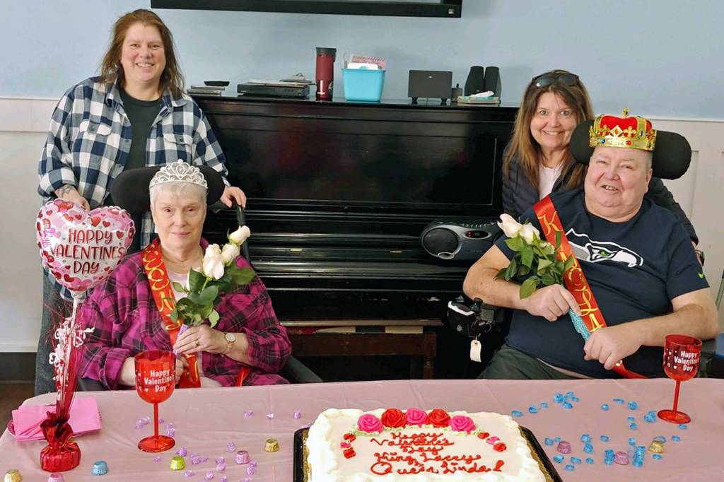 Each February, Pacific Care staff members vote for residents to be honored as Valentine king and queen. Then, during the Hoquiam facility’s annual Valentine’s Day party, the royals are celebrated with crowns, flowers, punch and cake. This year’s queen is resident council president Linda Gladson (left, with daughter Kristine Gladson is standing behind her). The king is resident council vice president Larry Schoening (whose sister Tammie Jacobs is standing behind him).
