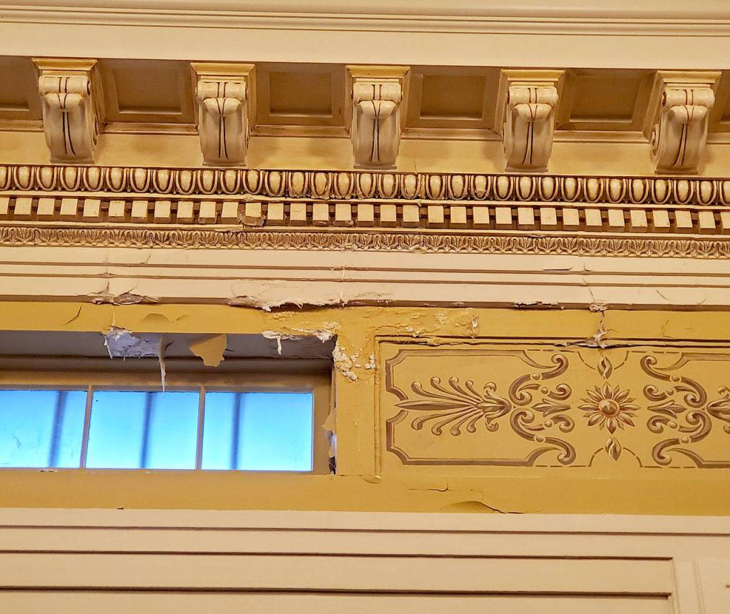 Water has leaked in from the roof and damaged plaster and decorative painting in both third floor Superior Court courtrooms. The murals that adorn multiple walls in the courthouse were not damaged.