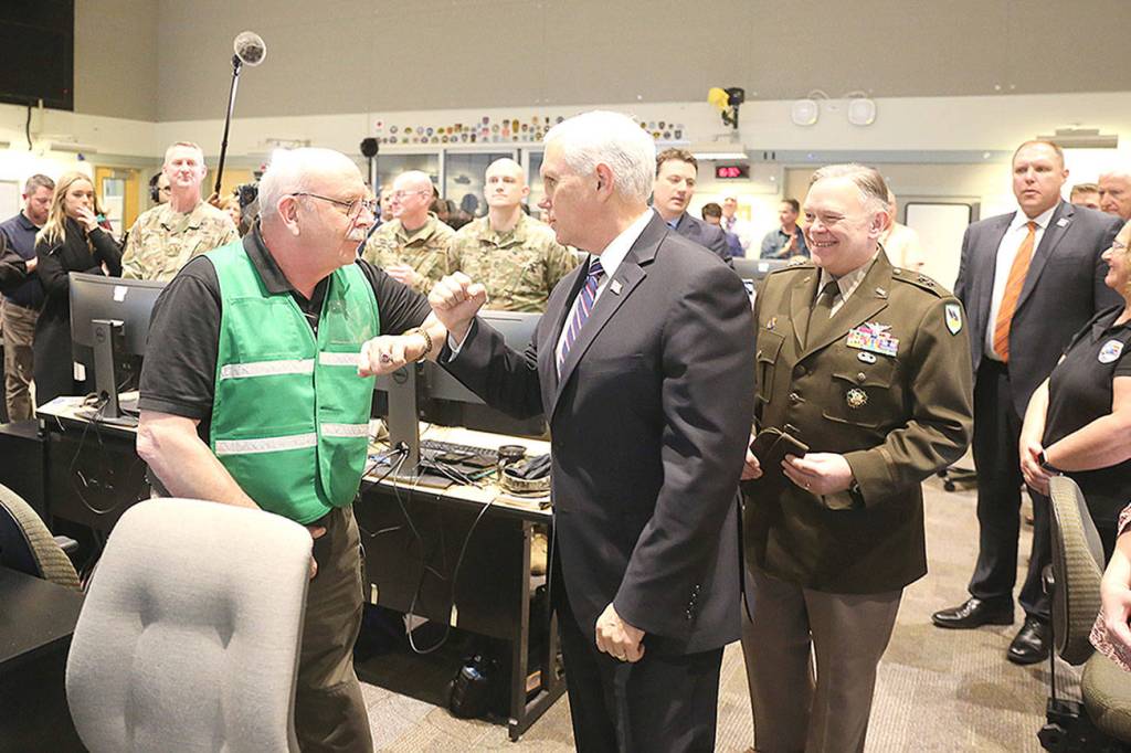 CAMP MURRAY — Vice President Mike Pence brought praise Thursday for the state’s response to the COVID-19 outbreak, assurances of federal help and much needed supplies to aid in that effort.