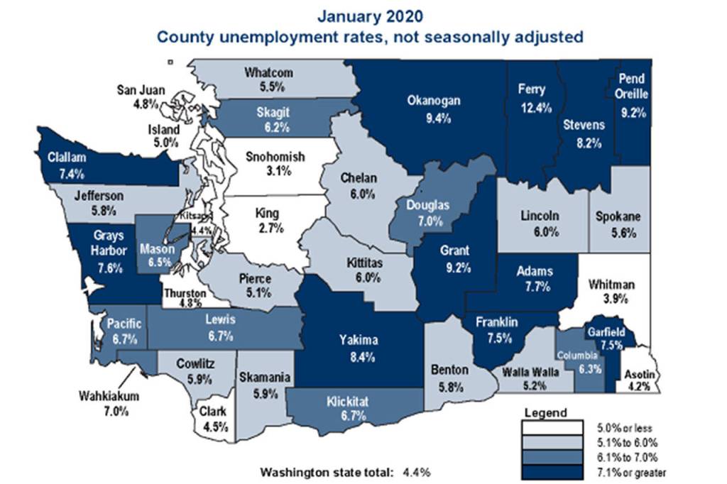 Ferry County, in the northeastern part of the sate, had Washington’s highest rate at 12.4%, while King County had the lowest jobless rate at 2.7%.