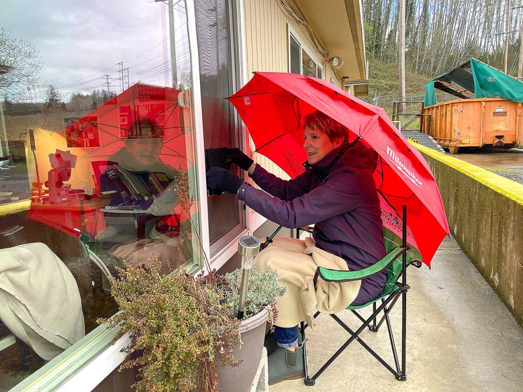 Saturday, I called Pacific Care to let them know I would be coming to visit my dad through the window screen. I asked that a staff person bundle my dad up in a coat with a blanket over his lap and open the window. By the time I walked around the building an aide was busy assisting with his coat, etc. Lucky for me there is a sidewalk right outside of the window. I came prepared with a camp chair and a large umbrella, which I needed! We each scooted our chairs up to the window screen for a conversation with “social distance.” While there I called my sister in Olympia. It happened that she was in the process of initiating a ZOOM call with my brother and sister-in-law living in Wrangell, Alaska. We decided that I should join that call and then found that holding my phone screen up to the window screen facing my dad allowed him to be “face to face” with the Wrangell family. The window visit turned out to be a 6-person family catch-up.