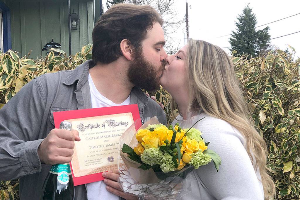 So then we developed Plan D, they would drive to my house and be married in my garage here in Central Park. They each brought a high school friend to bear witness. I had to hastily run to Safeway for a bottle of bubbly, flowers for the bride, some dessert (M & M cookies) and a wedding gift. Since it did not rain that afternoon, I set up a table on the driveway with the assorted wedding paraphernalia plus the marriage certificate and their first wedding gift — a 6-pack of TP complete with a bow! At 2 p.m., the designated time the wedding was to be held in Sumner, the happy couple were married in my Central Park driveway with two friends bearing witness and live streaming it through iPhones to family members! And yes, we were all six feet apart until they became husband and wife with a kiss. We clapped and had a cookie. They loved the TP as they were almost out. Then they climbed back in their cars and headed back to Tacoma, legally husband and wife to navigate their new life through COVID-19. The full wedding will hopefully be done later this summer.
