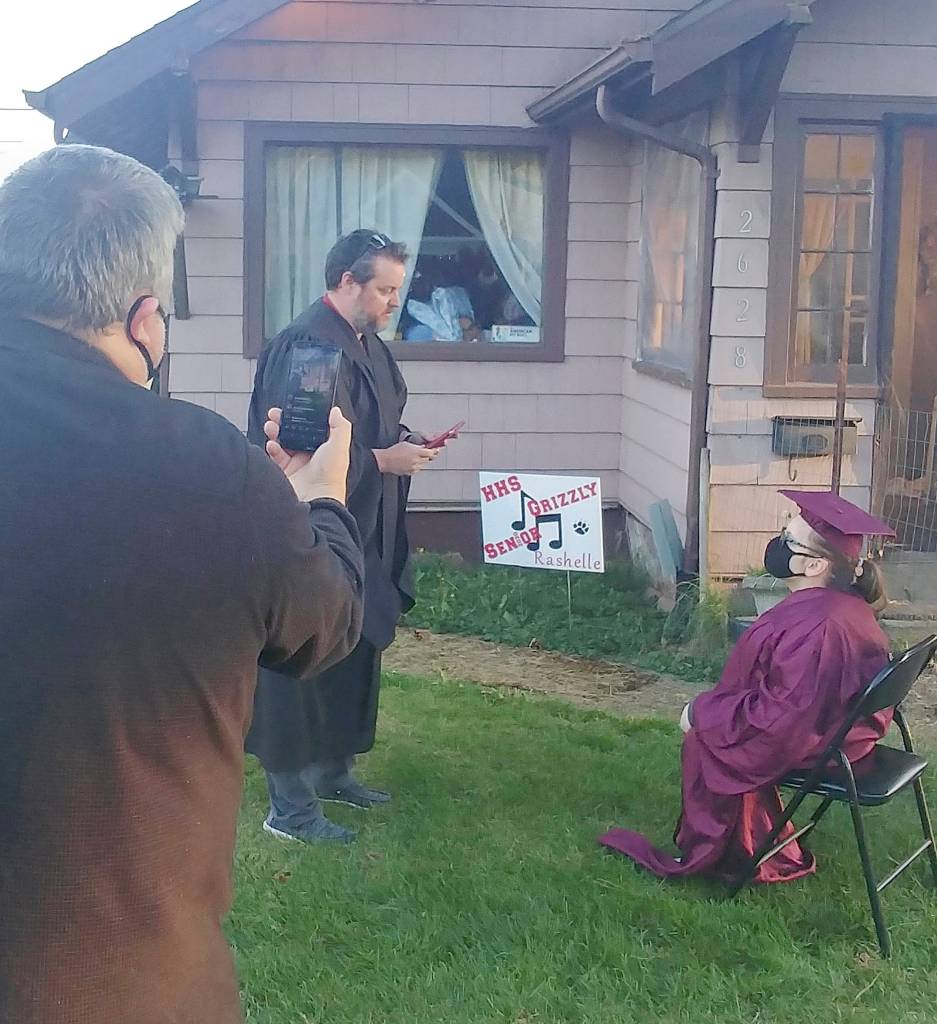 After the parade, the family got a special surprise: HHS Principal Brock Maxfield and several of Rashelle’s teachers returned with a cap and gown for Rashelle to wear, and they conducted a mini graduation ceremony on the front lawn for her mother could see.