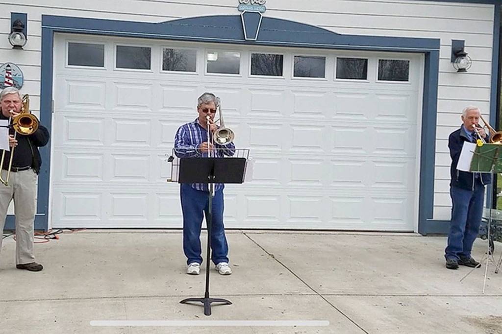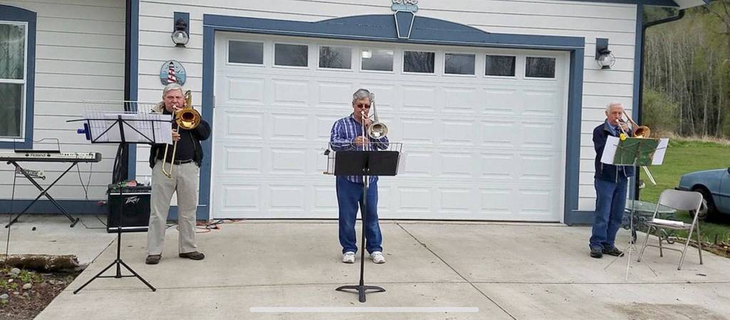 It’s more of a driveway band than a garage band, but Paul Miller and a couple of his trombone friends have a steady gig Sunday mornings playing hymns to a socially distant audience of the folks who live across the street from Miller at the Montesano Health and Rehabilitation Center.