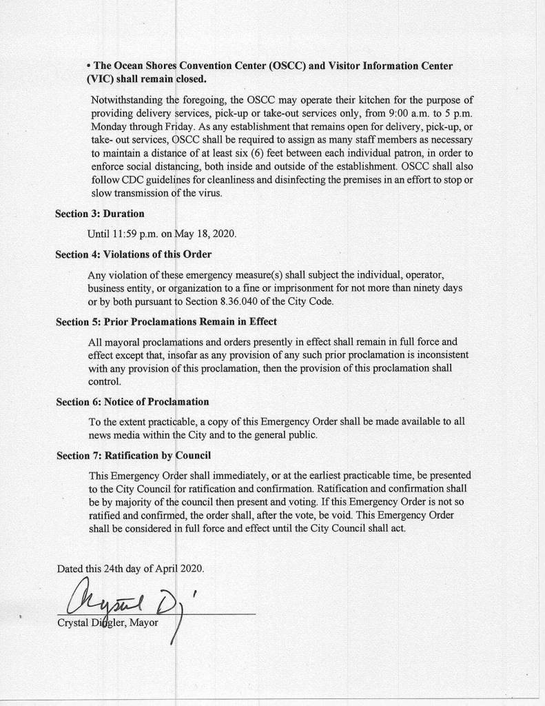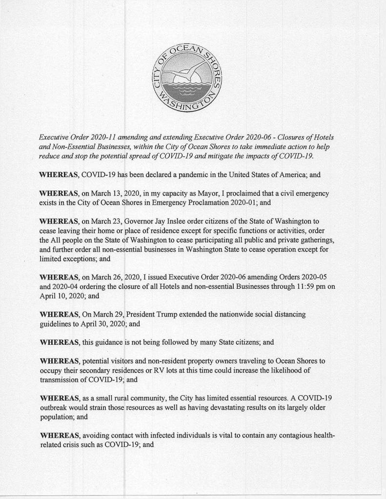 In an executive order signed by Dingler Friday, she said the social distancing guidance “is not being followed by many state citizens,” and said, “potential visitors and non-resident property owners traveling to Ocean Shores to occupy their secondary residence or RV lots at this time could increase the likelihood of transmission of COVID-19.”