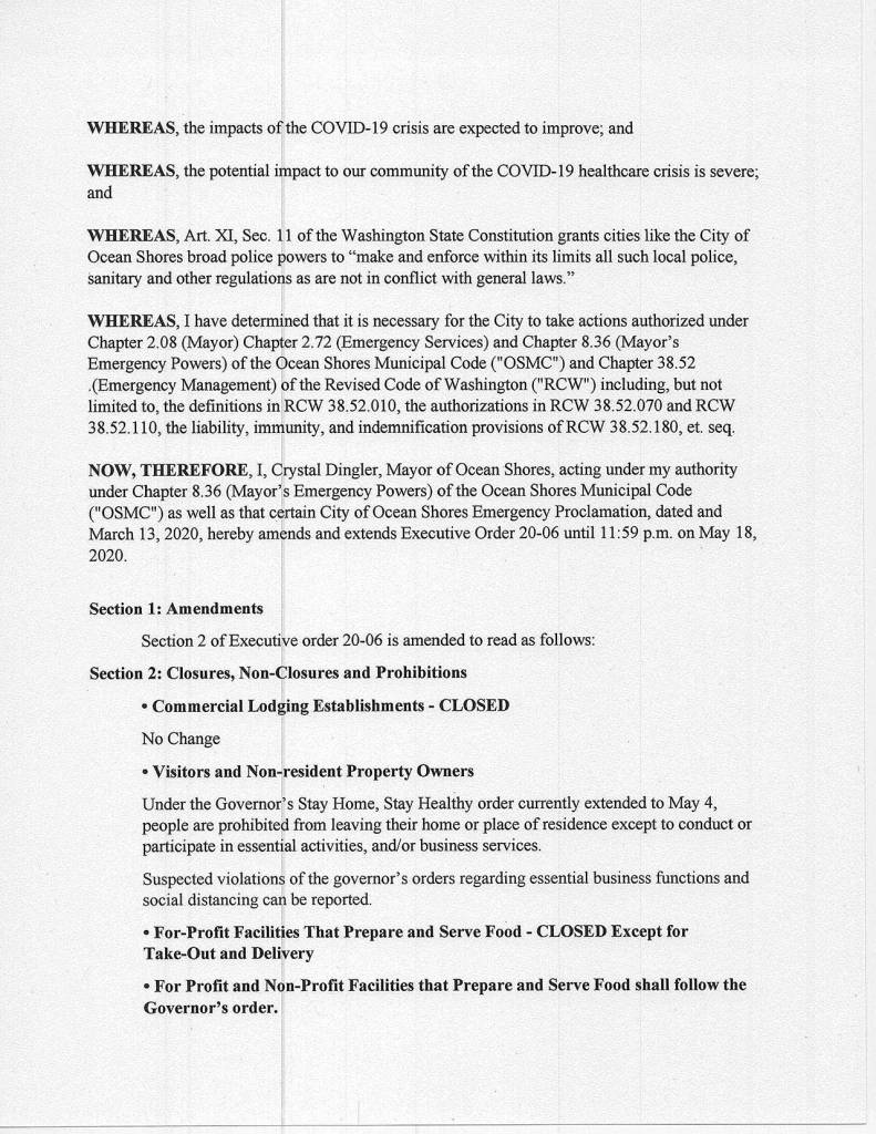 Citing health risks posed by people not following social distancing guidelines, Ocean Shores Mayor Crystal Dingler has extended the city’s COVID-19-related closures of hotels, nightly rentals and other “non-essential” businesses through May 18.