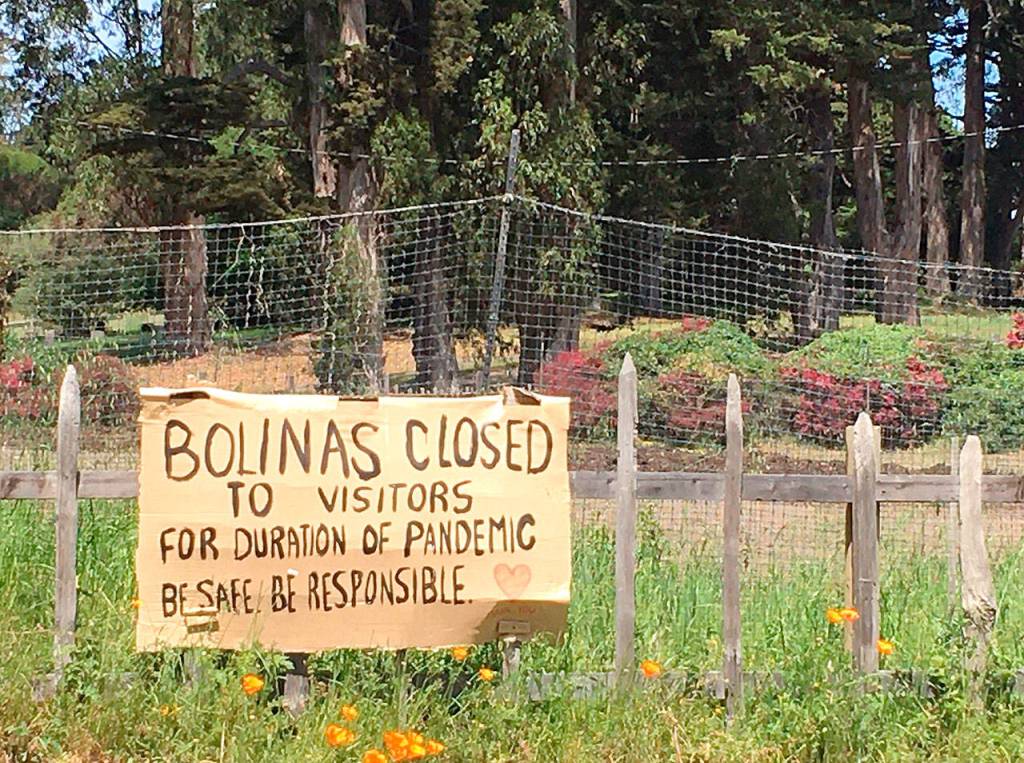Under a homemade “Bernie 2020” sign painted in red, residents hung two others: “Bolinas closed to visitors for duration of pandemic. Residents, deliveries only.”