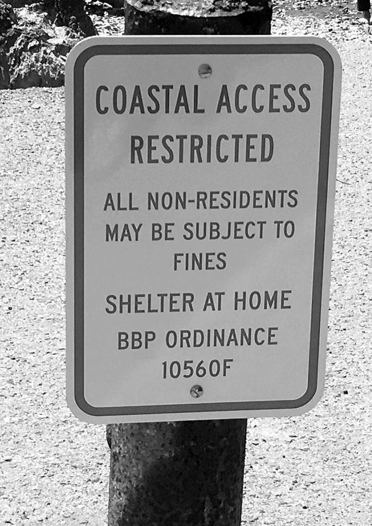 A city sign in front of a trail leading to the water reads: “All non-residents may be subject to fines. Shelter at home.”