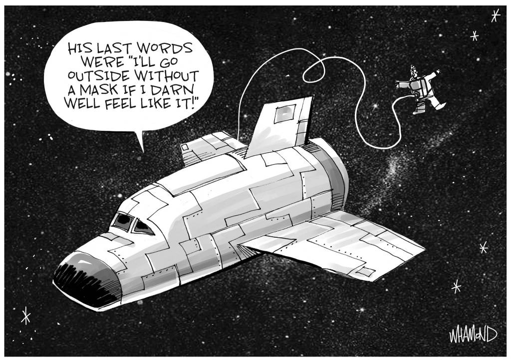 Today’s quacks want us to believe masks are for libs, which I guess redefines “lib” as someone who does not want to die. Wearing a mask to protect yourself and others is not an affectation. It is not the new latte or avocado toast. I can say with certainty that hot, soggy masks are a far cry from even diner coffee, and wearing one around the grocery store does very little for your social status.