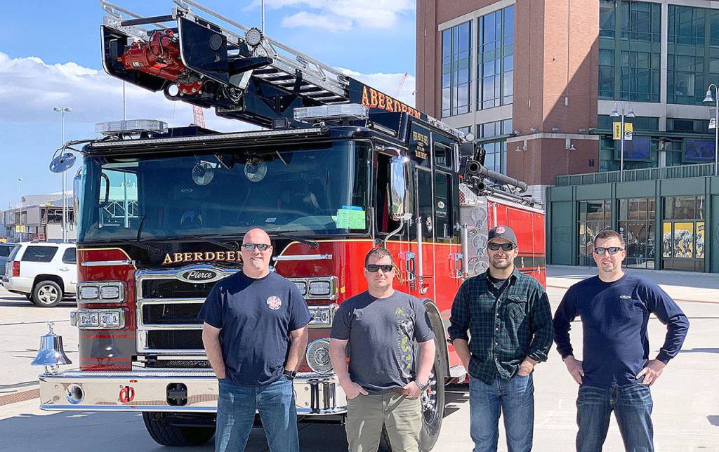 Aberdeen Fire Department new apparatus committee members flew to Appleton, Wisconsin earlier this month to inspect the city’s new pumper truck and skyboom. Pictured from left are firefighter Brian Peterson, Captain Mike Kolodzie, Captain Sam Baretich, and Engineer Brad Frafjord.