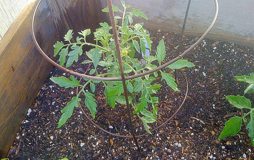 We insert the plant support after we put the tomato in the ground, being careful not to puncture the tomato stalk/roots.