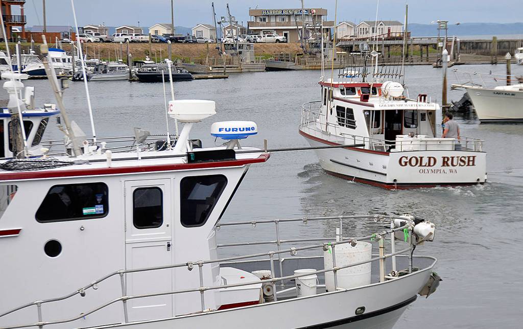 Westport charter boat operations will commence, with restrictions and limitations, Thursday. The Gold Rush, pictured here leaving Westport Marina last August, can carry 8-11 passengers from up to eight households. The Hula Girl in the foreground will also start fishing for lingcod and rockfish Thursday.